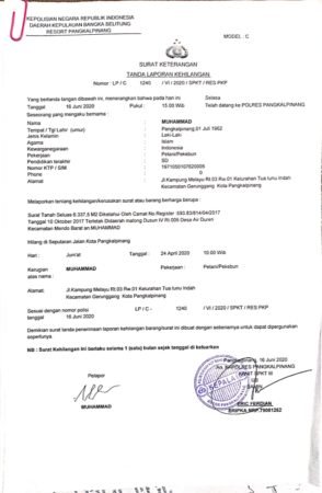 PANGKALPINANG- Aspirasipos.com, Merasa telah kehilangan surat tanah atas nama Muhamad , Derektur PT Pberlys Jaya Properti Subuadi mendatangi Polres Pangkalpinang selasa, 15 September 2020 untuk membuat laporan kehilangannya.