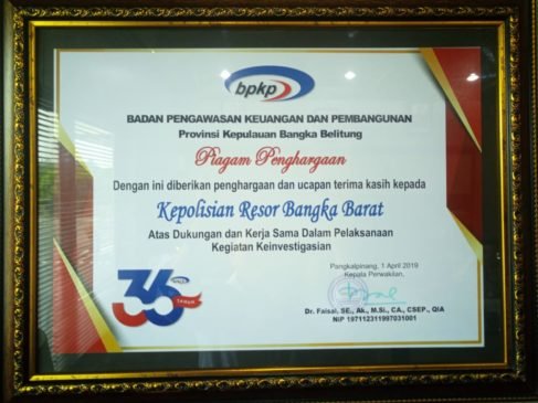 “Polres Bangka Barat mendapatkan piagam Pengharganan ini merupakan bentuk apresiasi dari BPKP kepada Polres Bangka Barat dalam hal keaktifan dalam investigasi kasus tindak pidana Korupsi,” katanya Kasat Reskrim Seizin Kapolres Bangka Barat